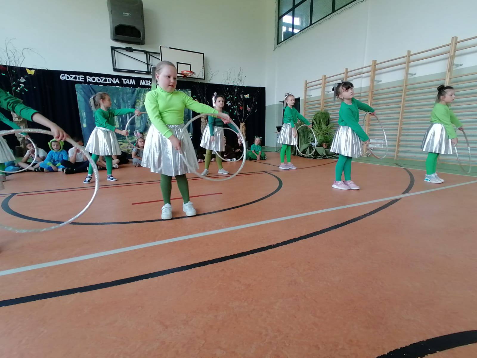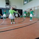 Dziewczynki z klasy 1b i 2 wykonały piękny taniec kosmicznych istot z obręczami.