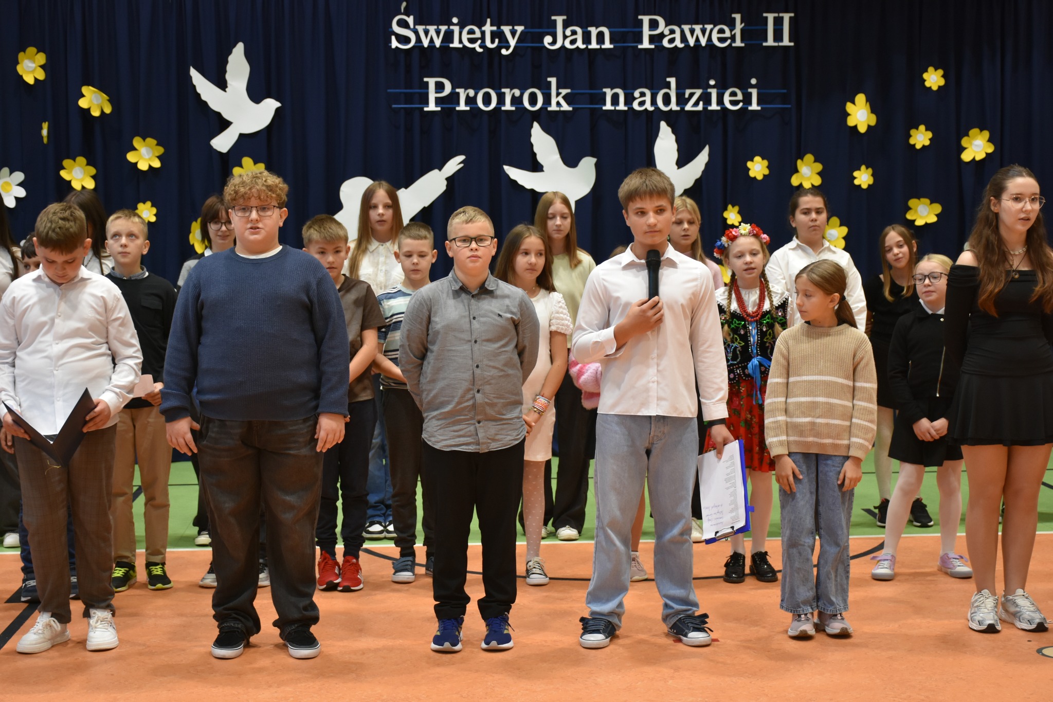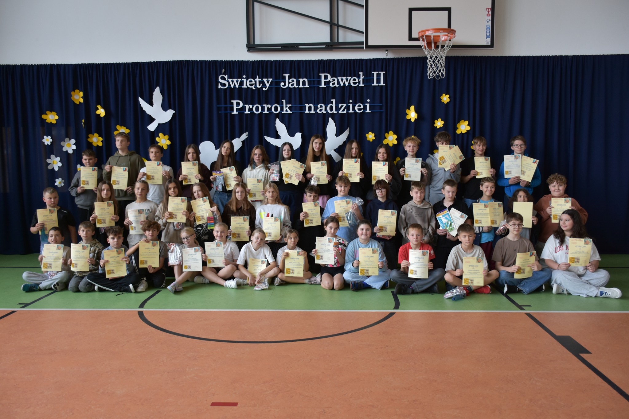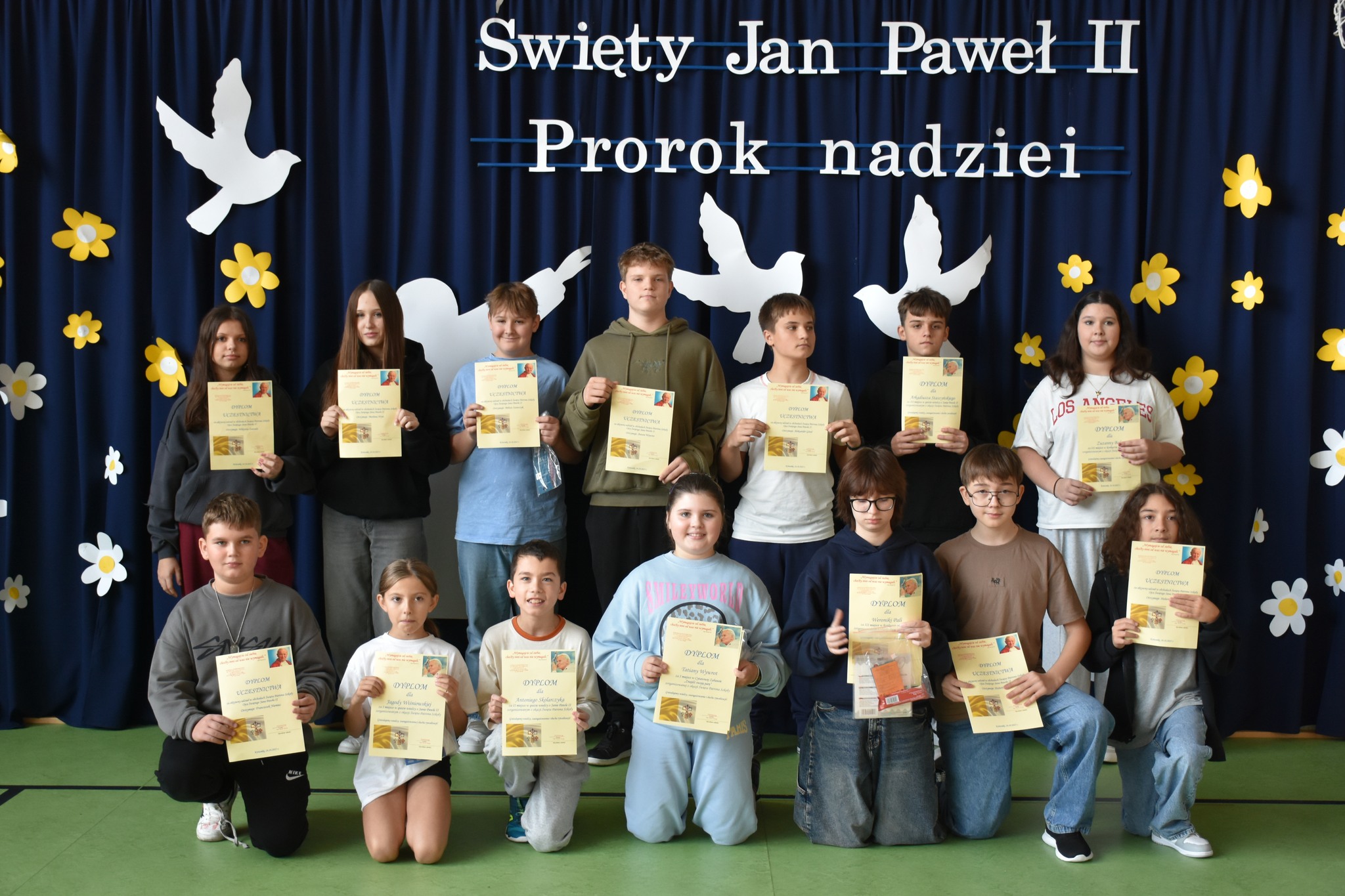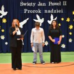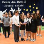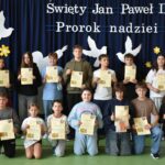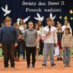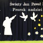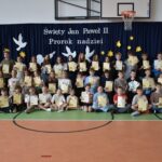 „Święty Jan Paweł II. Prorok nadziei”- to hasło tegorocznego XXV Dnia Papieskiego, obchodzonego w całej Polsce święta upamiętniającego człowieka, który swoją wiarą, mądrością i odwagą uczył kolejne pokolenia ludzi na całym świecie, że nawet w trudnych chwilach warto wierzyć i nie tracić nadziei. 24 października w naszej szkole odbyła się wyjątkowa uroczystość – „Święto Patrona Szkoły” połączone z obchodami Dnia Papieskiego. Uczniowie zaprezentowali społeczności szkolnej, a także przybyłym gościom program artystyczny, a także zadedykowali Ojcu Świętemu piękny taniec. Odbyła się również projekcja filmu biograficznego przybliżającego postać Karola Wojtyły. Po części oficjalnej miały miejsce liczne aktywności. Wielkim zainteresowaniem cieszyła się zabawa „Koło Fortuny” z Janem Pawłem II, zabawa z cytatami, loteria fantowa, a także konkurs wiedzy o papieżu, w którym wzięło udział bardzo dużo uczniów. Odbyły się także zawody sportowe oraz konkurs plastyczny pt. „Jan Paweł II oczami dzieci”. Szczególną radość wśród uczniów wzbudził kiermasz słodkości, w którego przygotowanie z ogromnym zaangażowaniem włączyli się zarówno nauczyciele jak i rodzice dzieci. Całkowity dochód z tego przedsięwzięcia przeznaczony zostanie na zakup gabloty na sztandar szkoły.